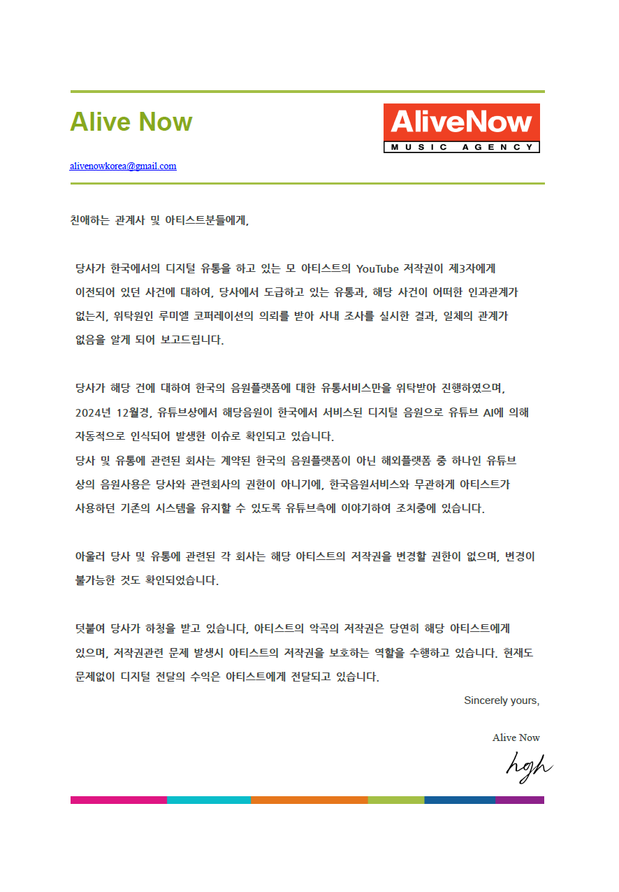 この際、MELON流通にかかわるすべてのエージェントに対しなんの連絡もなく、Youtube韓国独自で行われたようで、現在ALIVE NOWの上位エージェントであるアールスミュージックよりホワイトリストの提出など、該当アーティスト様に収益取得権が戻るよう対応を進めているとのことです。