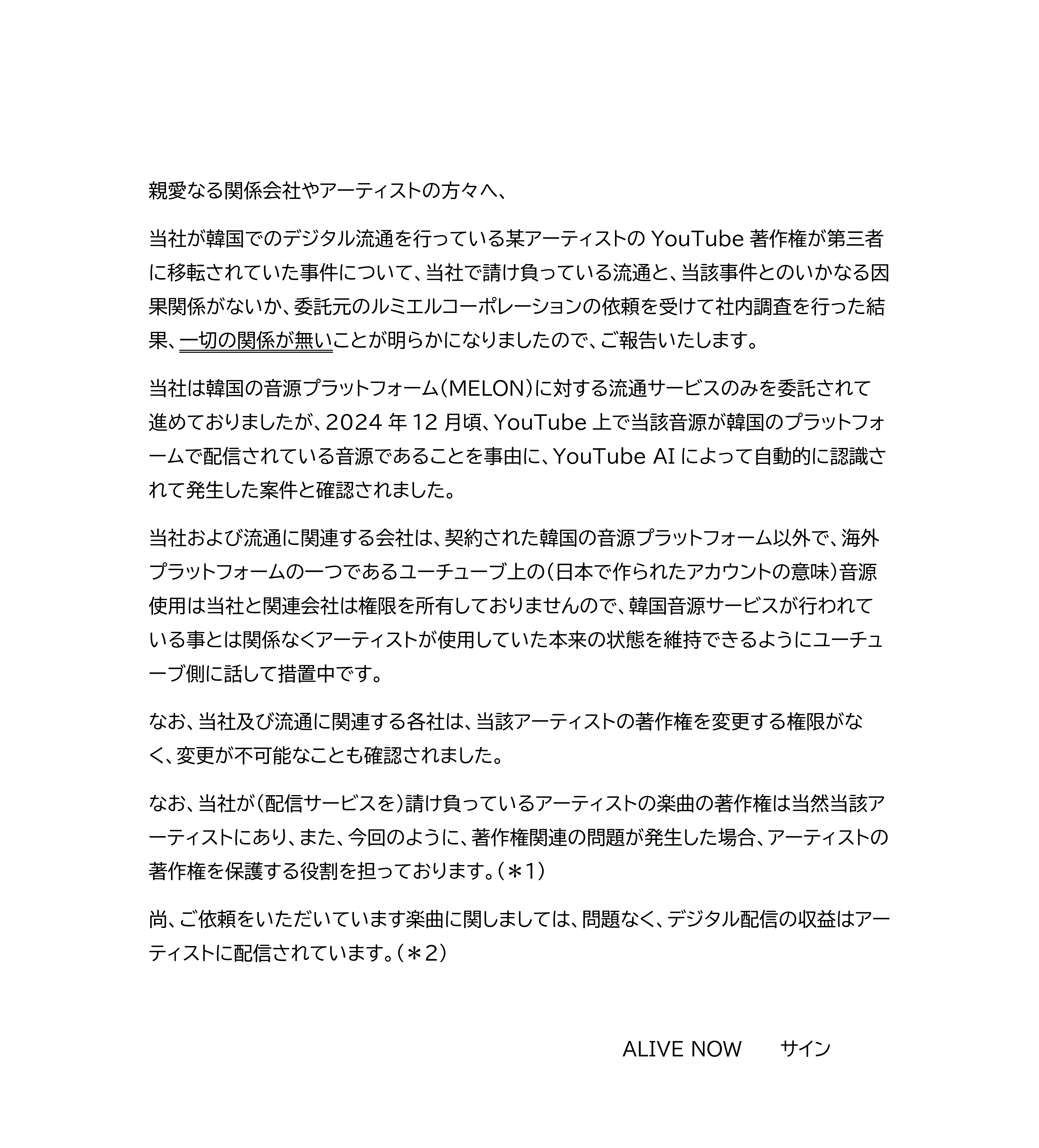 本日ALIVE NOW様より正式な回答が来ましたのでご報告いたします。原本は韓国語と英語にて発行されております。